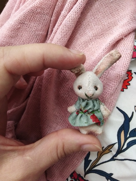Моя первая работа. "Зайка. " ткань, бисер, акварель, булавка. Высота 5, 5см с ушами). Ныряем под кат. Фоток много.