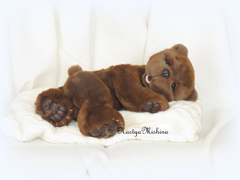 Хочу показать вам недавно сшитого мною мишутку. Сшила я его из немецкого плюша Альпака. Набит он древесными опилочками с добавлением стеклянного гранулята. Конечно же шплинтовое соединение. Лапки все крутятся, а голова качается. Глазки стеклянные. Немного тонировала глазки и носик. Ростик 18, 5 см. Получился мишка хорошенький, как котенок))