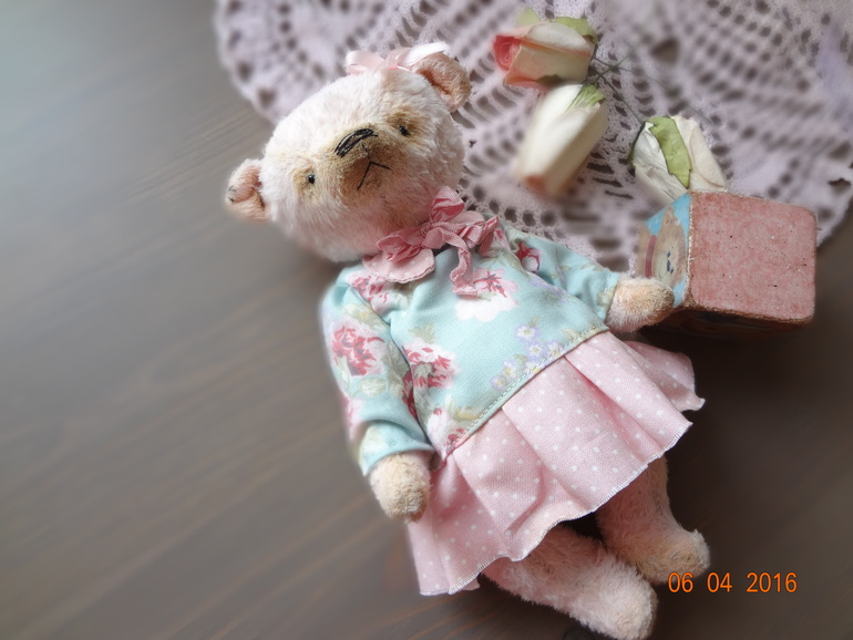 Очень люблю шебби стиль и вот в очередной раз сшила мишку тедди в этом стиле. Люсенька получилась немного грустной и трогательной. Сшита из вискозы пыльно-розового цвета. Внутри опилочки и металлический гранулят.Шплинтовое крепление,голова плавно покачивается. Сидит мишка уверенно,стоит с поддержкой. Мишка тонирована художественными масляными красками.Люсенька одета в платье из хлопка,украшенное воротничком и бантиком. Мишка сшита полностью вручную с большой любовью и теплом. авторская выкройка.