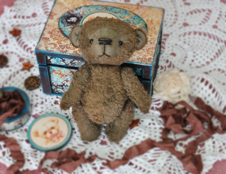 Мишка совсем кроха. Ростик 16см. Сшит полностью вручную из немецкой вискозы. Набит плотненько опилочками,утяжелен стальным гранулятом. Состарен,немного штопки. На шее бант с ключиком.