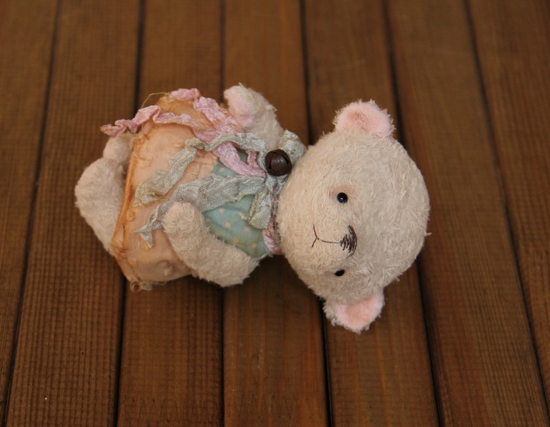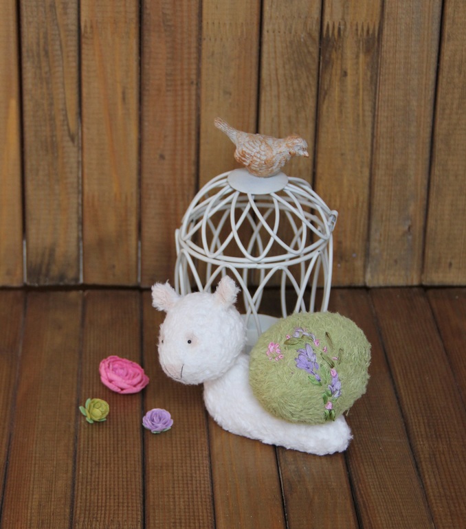 Мне очень нравится разглядывать вышивку лентами. Не так давно приобрела набор для вышивания шелковыми ленточками на тему луговых цветов. Немного пробую на моих игрушках: эту улитку тедди захотелось сшить с зеленой раковинкой и украсить сиреневыми и розовыми цветами.