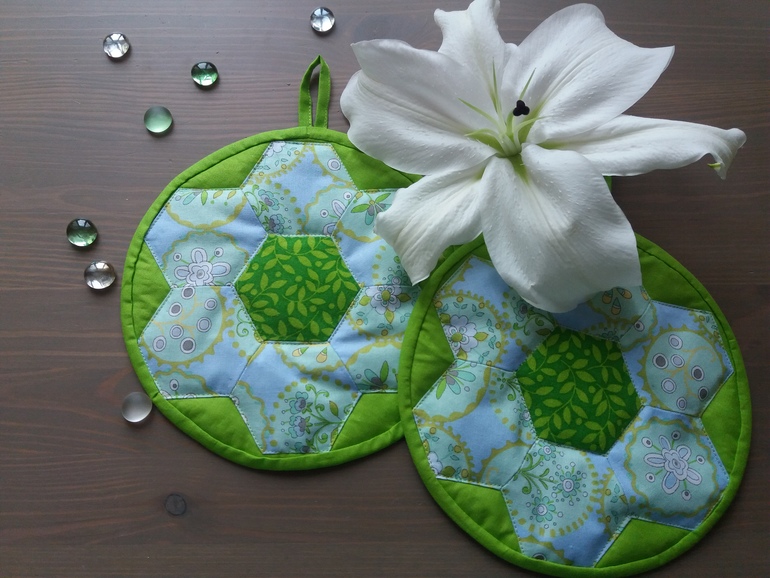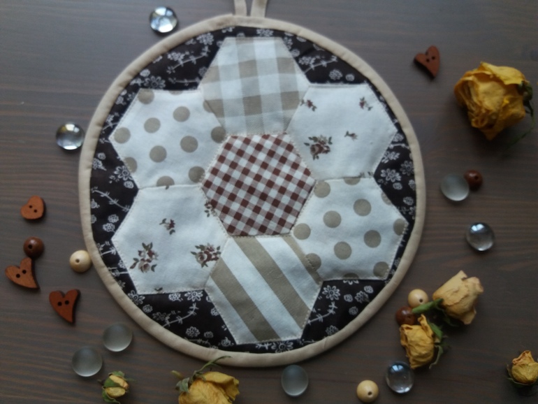 Вдохновившись вчера на выставке, загорелась сшить из шестигранников.Благодаря набору, что купила накануне оказалось совсе не сложно шить. Сшила для начала прихватку на кухню.Но думаю я на этом не остановлюсь, очень мне понравилось.
