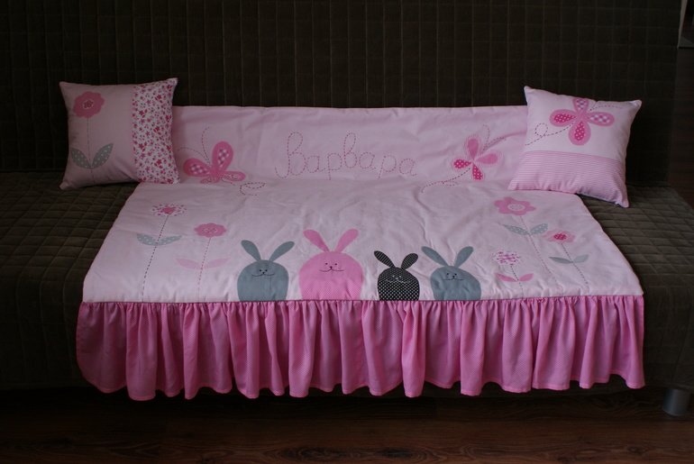 Весь комплект шился специально под их чудесную кроватку с зайчиками. Одеялко 90*200 и две подушки.