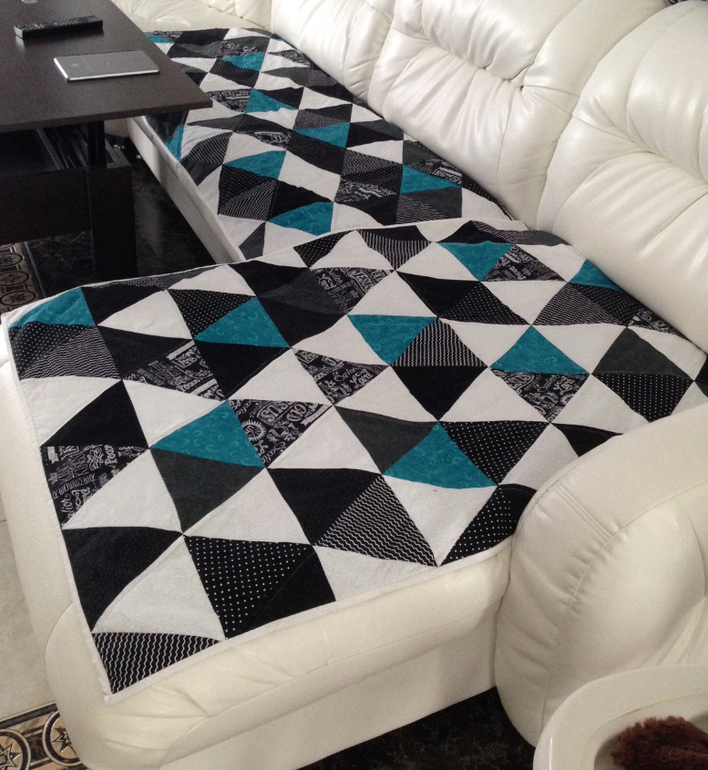 Комплект из двух покрывал, черно-белое с бирюзой для черно-белой гостиной. Покрывала сшиты из американского хлопка, наполнитель хлопок.