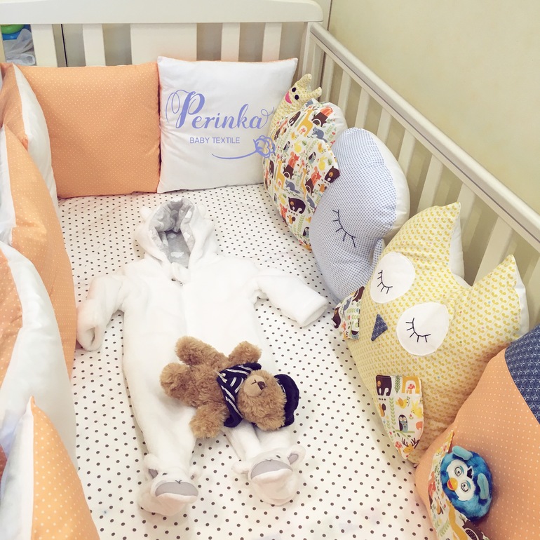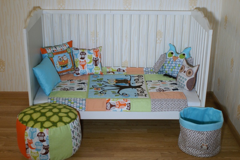 давно я тут ничего не показывала, а работ много скопилось за лето))) Сегодня покажу большой комплект в детскую с совами. Комплект на малышковую кроватку и ее окружение. Тут стеганное покрывало 100*70, 3 декоративные подушки, подушка-совушка, совушка-сплюшка, пуф и текстильный короб для хранения игрух.