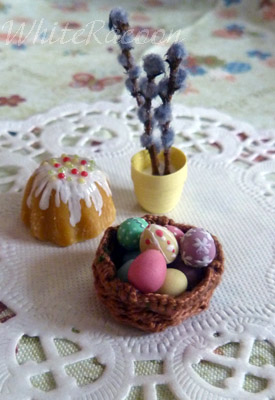 Из флористической глины, продолжаю эксперименты для Сильванчиков. Размер, наверно, близок к 1:12. Кулич, писанки-крашенки, верба. Кулич 17мм х12 мм, яйца по 6 мм, корзинка 19 мм, верба 35 мм.