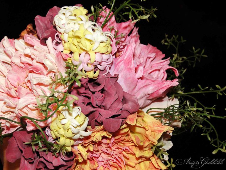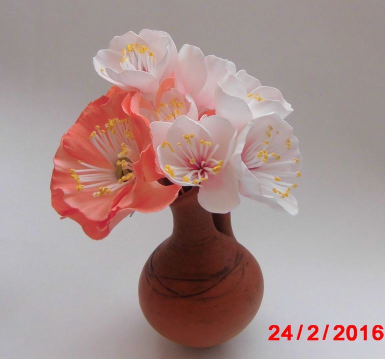 *Цветы из фоамирана, букетик собран "на живую", не стационарно, пока что в бокале, наверное ждет свою маааленькую круглую вазочку из прозрачного стекла ;-), в процессе, в общем...