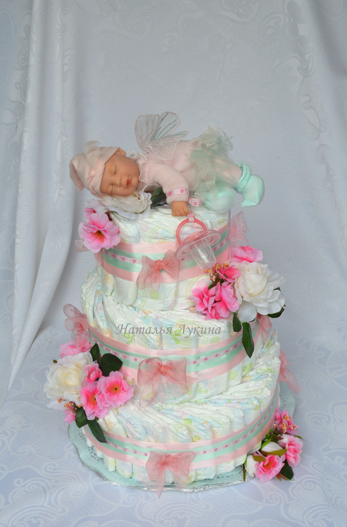 Всем привет! Покажу сегодня тортик, который делался на заказ для девочки,с моей любимой куколкой от Anne Gedes. В торте 72 шт памперсов Merries, соска Avent 0-6 мес, куколка крошка-эльф.