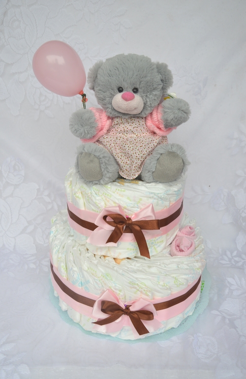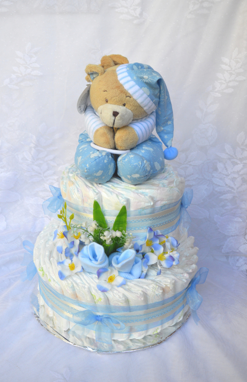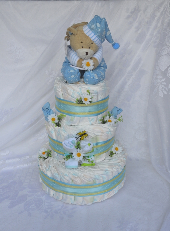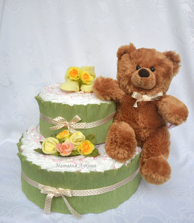 Привет всем! Этот тортик еще не показывала. 2-х ярусный. Памперсы Хагисс элит софт 54 шт. 2 пары носочков. ну и мишка. Очень понравилась цветовая гамма. Делался для мальчика, но мне кажется можно и для девочки.