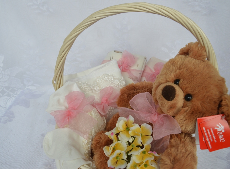 Тортик для мальчика нежный и весенний. В комплекте: музыкальная игрушка Медвежонок, 2 слюнявчика и пара носочков.