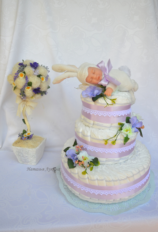 Всем привет! Хочу показать свой новый тортик из памперсов с детскими носочками и мягкой игрушкой с настоящим шариком!