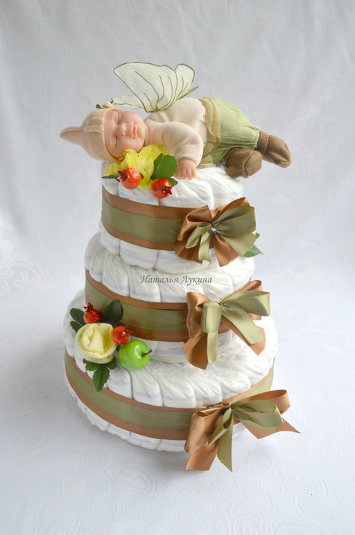 Новый тортик из памперсов с коллекционной куколкой Anne Geddes и детскими носочками.