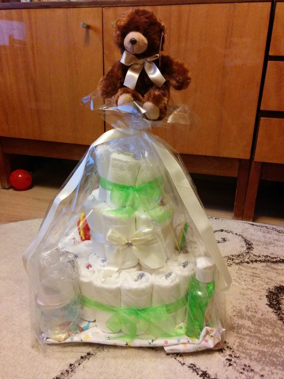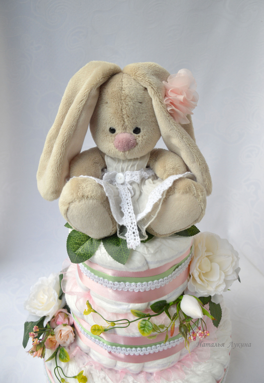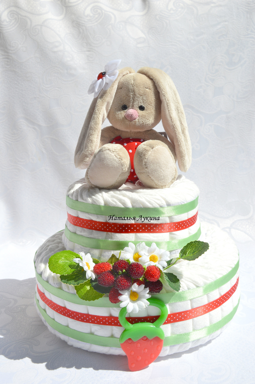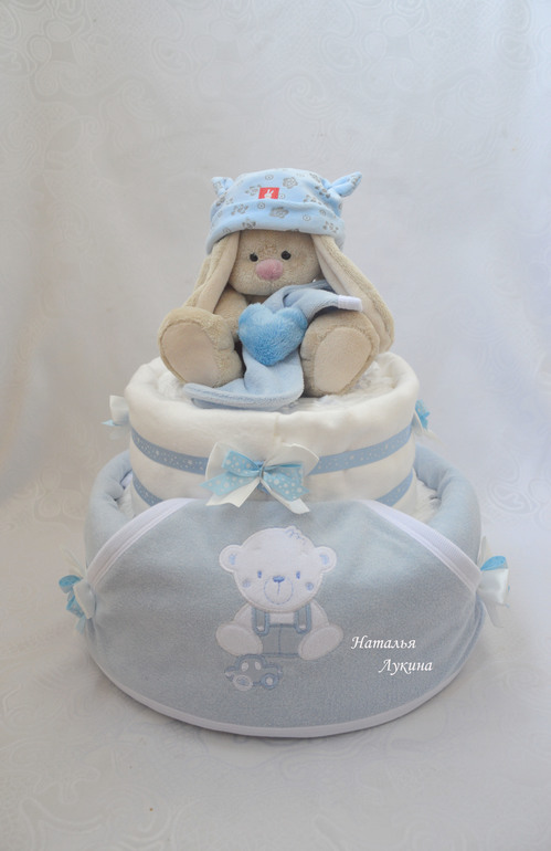 Вот такой интересный заказ был у меня недавно. В составе тортика памперсы 54 шт, детское полотенце с уголком, рукавичка для купания, фланелевая пеленка, и зайка Ми в голубой шапочке.