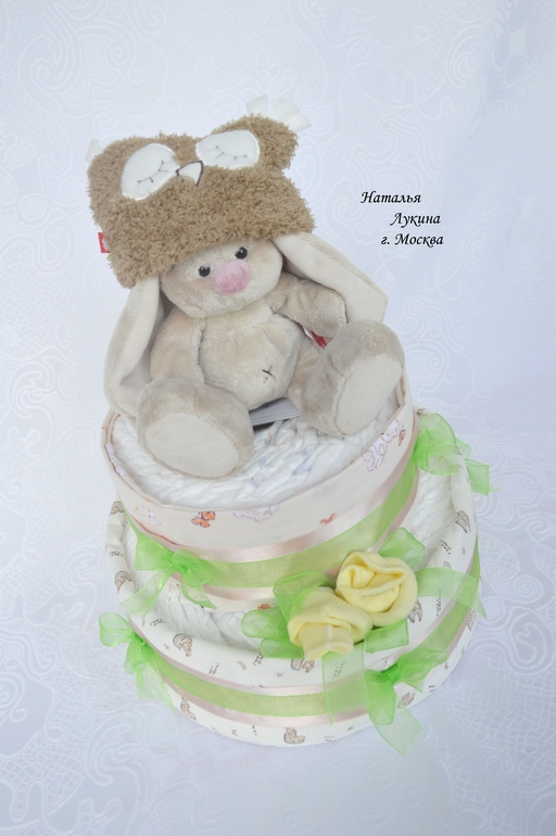 Торт из памперсов с детскими пеленками, носочками и игрушкой зайка Ми в шапочке "Совенок".