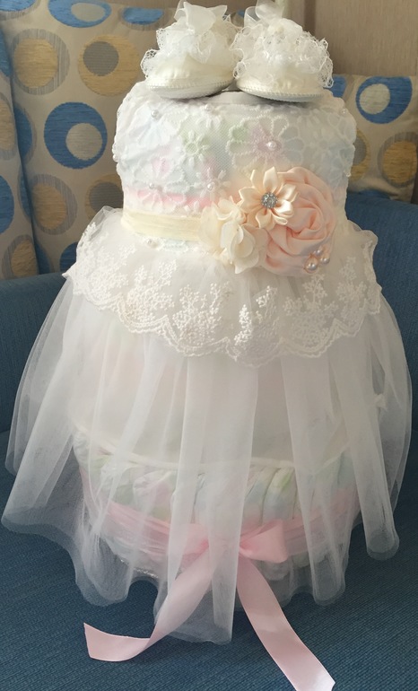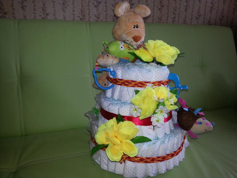 У племянника родилась дочка, по этому случаю соорудился такой тортик. Давно хотела попробовать сделать торт из подгузников и вот он первый ))). На мой взгляд - очень даже ничего ))). Следующий торт будет для подруги: она должна в августе мальчика родить