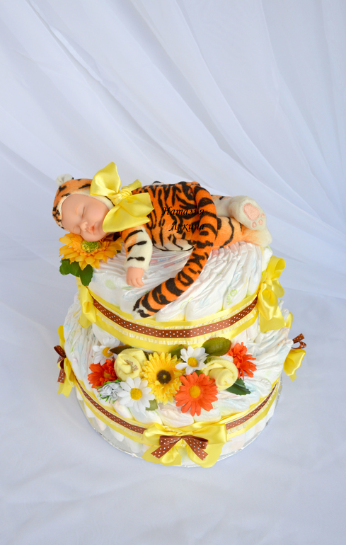 На улице светит солнышко,Весна,тепло. И у меня яркий тортик с игрушкой от Anne Geddes Тигренок.Был сделан в подарок очаровательному малышу. В составе памперсы Merries, детские носочки и игрушка.