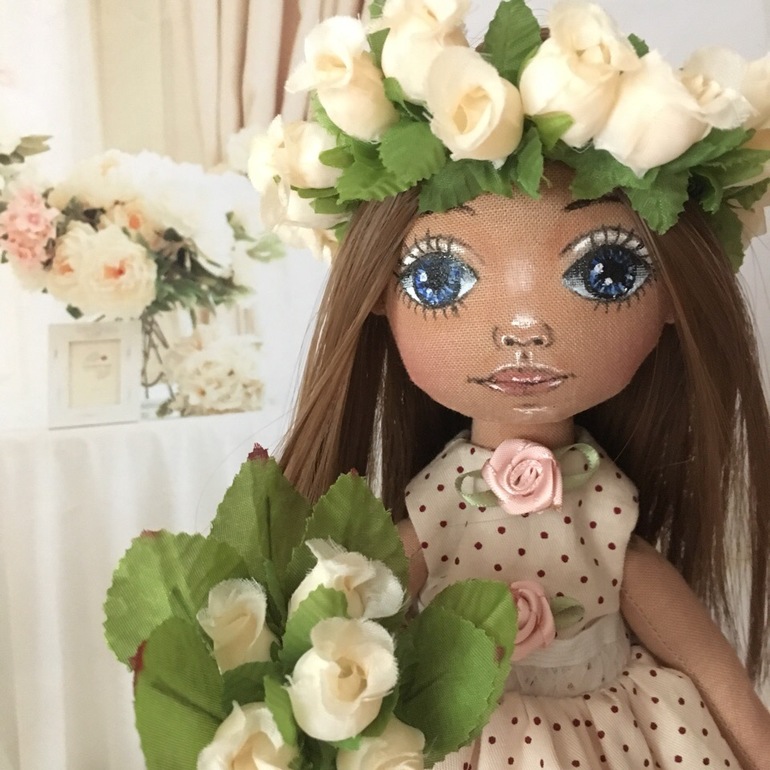Доброе утро! Покажу вам новых малышек, ростик 7см, сшиты из хлопка., ручки слеплены из фимо, личико расписано акрилом, маслом и пастелью. На блондиночке платьице из жатого хлопка и вышивкой.) Шапочка связана спицами. У кудряшечки волосы букле.Покажу две брошечки, остальных малышек попозже).