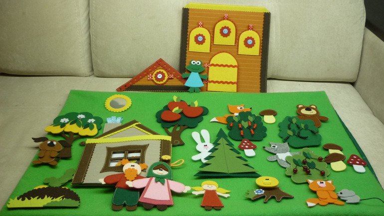 "Колобок- Курочка Ряба", " Репка", "Теремок". Игровое поле выполнено из велкроткани и сшито в виде наволочки, внутрь которой нужно вставить картон или пластик. Размер поля 40*60см.