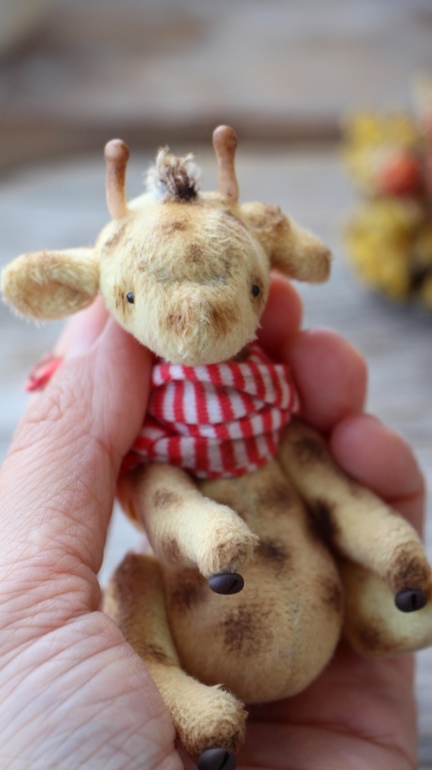 Добрый день! У меня Жирафик) Малыш сшит из плюша. Тонировка маслом. Копытца и рожки из полимерной глины. Льняные гривка и хвостик. Сидит забавно. На шее трикотажный шарфик. Настоящий маленький друг..умеет хранить секреты). Ростик 11см.