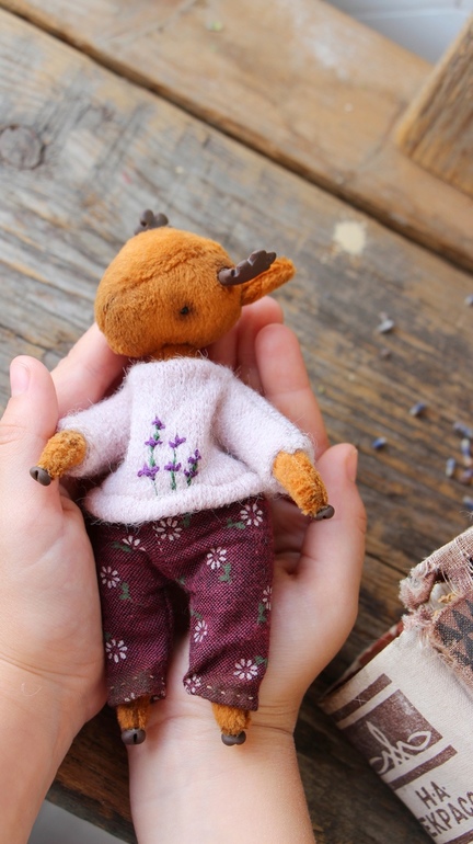 Ещё один Лосик.. сшитый из плюша. Головка подвижная на шплинте.Ножки и ручки на пуговках. Набит малыш гипоаллергенным холлофайбером "лебяжий пух". Тонирован маслом.Копытца и рожки слеплены из фимо. Пудровый свитерочек из трикотажа, вышивка мулине. Штанишки из японского хлопка. Нарисовала акварельную открыточку к нему. Ростик малыша 10см.