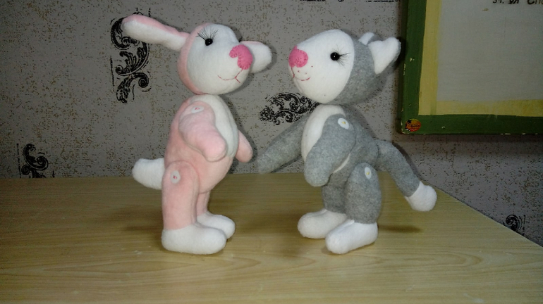 После розовой собачки (которая уже дома, и зовут её теперь Дуся), мои девчонки таки уговорили меня на "а наааам игрушки???" выбрали в интернете, на что должно быть похоже, и мама ударилась в творчество - адаптация выкройки, споры с "заказчиками" о цвете... Результат вышел примерно таким (фото только "тапковые", нормально снять невозможно, не выпускают из рук)