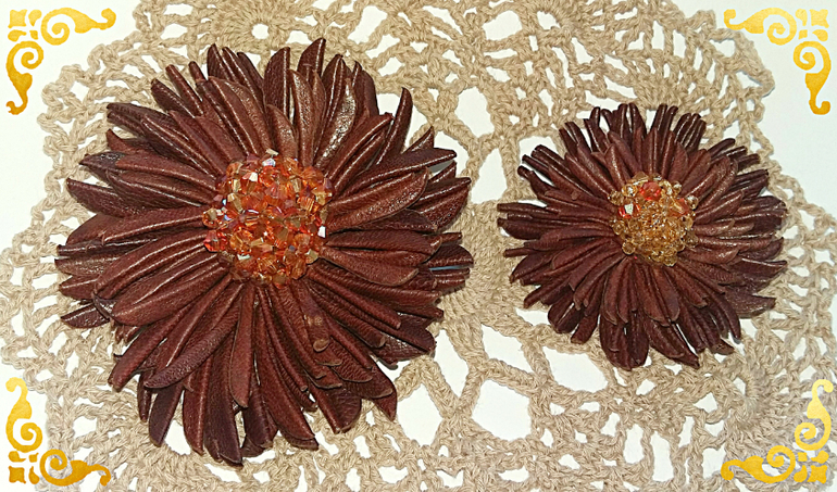 Делала в подарок брошки из натуральной кожи для мамы и ее доченьки (1 годик). До этого уже делала подобную желтенькую брошку.https://www.babyblog.ru/community/post/rukodelie/3196057 Эти делала по этому же принципу: вырезала 4 цветка побольше и 4 поменьше. Склеила кажд. лепесток, придала им форму, сшила их вместе и потом в хаотичном порядке пришила гранен.бусины в серединку. На большую брошку ушло около 150 шт. размером 4 мм, на маленькую поменьше размером 2 мм и неск.штучек 4 мм.. Под КАТом более 5 фото: