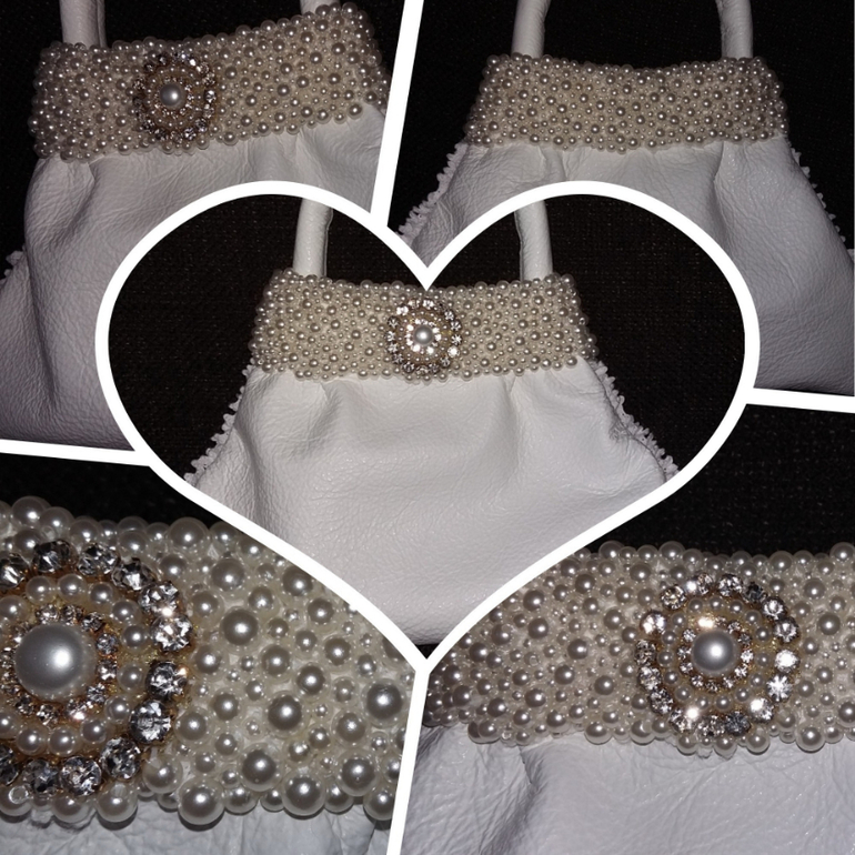 Пошилась у меня вот такая нежная сумочка из натуральной кожи для подружки сына на ее день Варенья (5 лет). Шила ее руками без машинки. Высота примерно 16 см. По-началу думала, что дело будет быстрее, но самое долгое оказалось это пришить эту тонну жемчужинок. Шила сумку по ночам и на жемчужинки ушло около 5 ночей по 4 часа в кажд.. Мое время было с 23 до 3-4 утра )))) Не ожидала, что они займут столько времени. А на пошив всего остального ушло около 2 ночей. Детали под КАТом (более 5 фото):