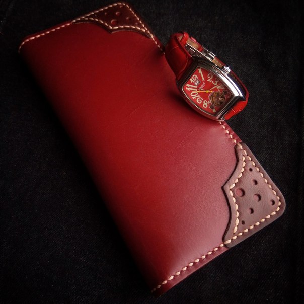 Разбираю фото и хочу показать, что мой муж сшил в подарок своей тёте: большой кожаный кошелёк, конечно же, красного цвета!😁👛Вы же тоже верите в магию красного цвета для привлечения денег?💳💲😉 Плотная кожа, вощеные нитки, кнопки - каркасная модель получилась. Прошивает все вручную, двумя иглами. Под катом фото в открытом виде.