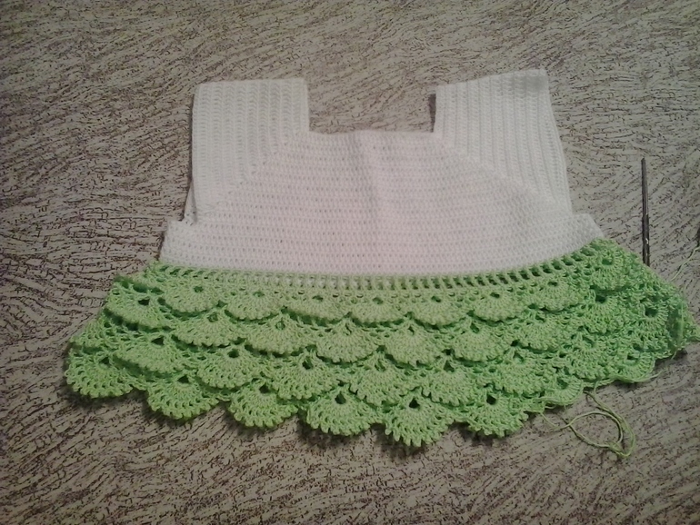 Я вязала из хлопка Пехорка "Успешная" крючки меняла по ходу вязания  от 1,3 до 2. А юбочка вяжется сразу от кокетки