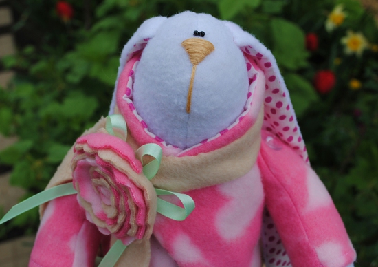 Морда другая и он толще намного,(выкройка сильно изменена) и Тильды шьются из натуральных тканей,в основном,хлопковых.И уши по-другому пришиваются.А этот зай из флиса,да еще белого,одежда- флис и вельвет.
