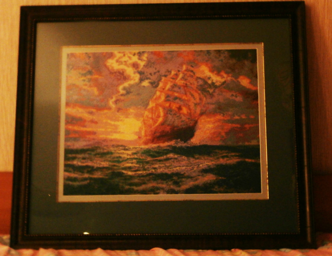 Спасибо! Сан-Франциско - частичная вышивка фирмы Кандамар, правда вышивки там очень много, впечатления отвратительные - схема не совпадала с рисунком, приходилось по ходу что-то придумывать, в работе используются целофановые нити для имитации дождя - более сложного в вышивке я не встречала, они все время рвутся, запутываются и проч. Правда результат превзошел все ожидания, были разногласия при оформлении - синее паспарту или зеленое, решили зеленое подчеркнуть зелень на картине, а с синим можно было запросто подхватить депрессию, было классно, но ооочень уныло и тоскливо)