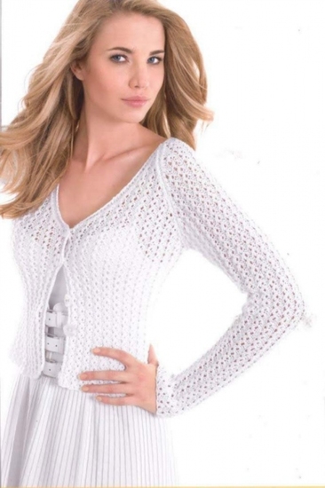 ЗАВЕРШЕНИЕ Сшейте плечевые швы. Кромка левой полочки Переда: Повернув работу ЛС к себе, с помощью круговой спицы начните от центра горловины на Спинке, наберите на спицу и провяжите лицевыми 118 (122-122-126-126-130) п. по краю набора петель левой полочки Переда. Начиная с Ряда 2, вяжите резинкой точно так же, как для рукавов, на протяжении 1 дюйма, закончите на ИС. Свяжите 1 ряд лицевыми, 1 ряд изнаночными. Закройте петли как лицевые. Наметьте точки для пришивания 6 пуговиц, первую на расстоянии 1 дюйма от нижнего края, последнюю у начала горловины, а остальные на равном удалении друго от друга между ними. Кромка правой полочки Переда: Повернув работу ЛС к себе, с помощью круговой спицы начните от ряда набора петель правой полочки Переда, наберите на спицу и провяжите лицевыми 118 (122-122-126-126-130) п. до центра горловины на Спинке. Начиная с Ряда 2, вяжите резинкой точно так же, как для рукавов, на протяжении 0,5 дюйма, закончите на ИС. Сделайте прорези для пуговиц на следующем ряду напротив маркеров следующим образом: 2 лиц. вм., накид. Завершите точно так же, как для кромки левой полочки. Сшейте концы кромок Переда вместе в центральной точке горловины по Спинке. Вшейте рукава. Сшейте боковые швы и продольные швы рукавов. Пришейте пуговицы.