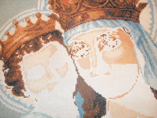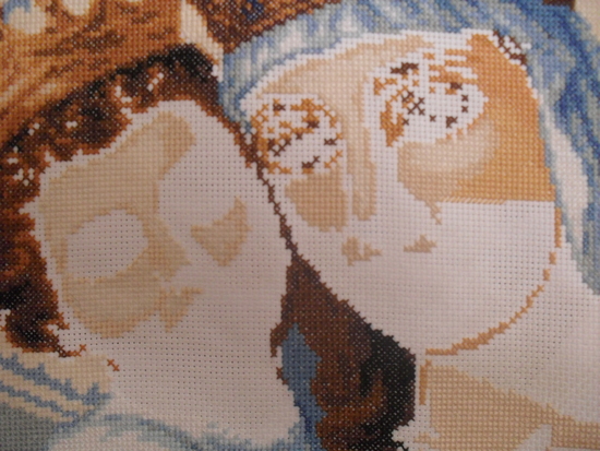 Давно ее вышиваю. Были перерывы на подарки. Так, давно бы закончила. Она мне очень нравится, поэтому вышивается без напряга. Единственно кажется, что лицо как апельсин.