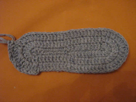 я вязала не по самой схеме, т.к. размер у нас совсем другой. крючок у меня 2,5 где-то (номер не знаю, самодельный). нитки малиновых беби акрил 100%, фиолетовых название не помню, хлопок 100%. фиолетовые хорошо форму держат. я набирала 15петель, во 2ю пошел столбик без накида, так весь ряд. в последнюю провязывала 3столбика и шла в обратную сторону. а там дальше уже сама по вязанию сморела где прибавить и все, необходимо чтобы стелька была ровная, не закручивалась, для этого в каждом ряду должны быть прибавки.