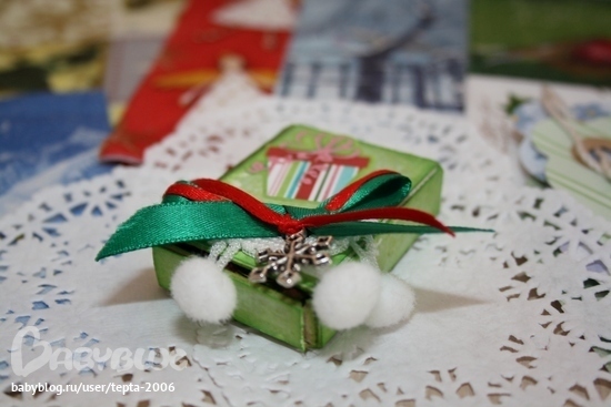 Праздничный коробок был полнёхонек самых разных малюсеньких и побольше, но таких незаменимых для любой творческой личности, увлкшейся скрапбукингом, мелочей. И бусины, и полужемчужины, новогодний сапожек, красивенная булавочка, "внушительная" объемная снежинка, пайетки, брадсы, пуговки, цветочки, разные елочки, отштампованный на ленте олень (просто класс!), ленточки и дырокольные цветы и бабочки. И как они сюда все поместились?;-)