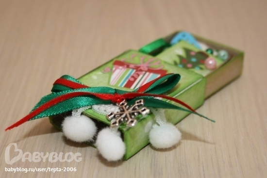 В нем оказались и красивенные салфетки для декупажа (вот и стимул попробовать что-то новое для себя!), и самодельный тканевый цветок! (нежный и трогательный - еще сохранил тепло рук Мастера), очаровательные наклейки с мишками, теги, пуговки, шармики, изящные иголочки (не уверена, что правильно называю), множество надыроколенных цветочков, бабочек, снежинок, огромное количество ярких лент. И это я еще не рассказала о самом MatchBox.