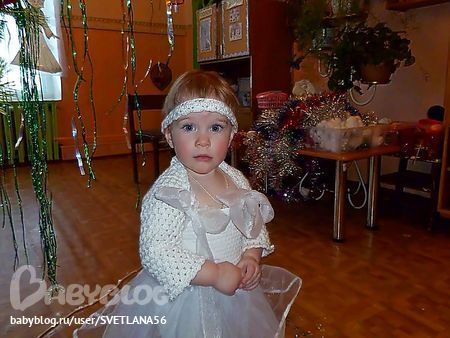 Это первый наш настоящий Новый год (не считая прошлый, нам всего было 2 месяца). Сестра у меня работает в дет. саду воспитателем и мы были приглашены на утренник. Что одеть дочери, я знала сразу. Осталось от племянницы платье ни разу не одеванное. И вот сестра сообщает за день до праздника, что в группе прохладно, а платье открытое. Что делать? Дома ничего подходящего не нашла, шить не из чего. И на ум пришла мысль связать простую накидку на плечики, а точнее болеро. И + повязка на голову и ГОТОВО.