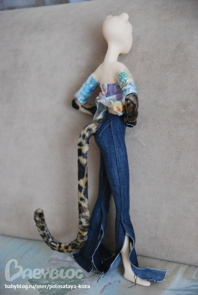 У меня кукла 40 см из паперклея. Она стилизована под леопарда - у нее длинный леопардовый хвост и руки видны только по локоть, сделаны как лапы. Ноги человеческие, полностью закрыты джинсами, чтобы не было перебора с леопардом. Кукла выкрашена в телесный цвет, но волос пока нет и лицо не прокрашено. Волосы купила, но не получается покрасить в нужный цвет :((( То как седые получаются, то слишком желтые. А хочу пшеничную блондинку и сделать каре. Верх пока не знаю какой. Начала делать какую-то блузку, но, кажется, не похходит, слишком цветастая. Хорошая идея сделать под ковбойский наряд. Надо подумать, а то не могу одежду подходящую придумать. То, что я изначально придумала уже не подходит, т.к. кукла сама получилась немного не такая как я хотела. Это же моя первая кукла. Очень трудно в реале воплотить свои представления, особенно выражение лица.