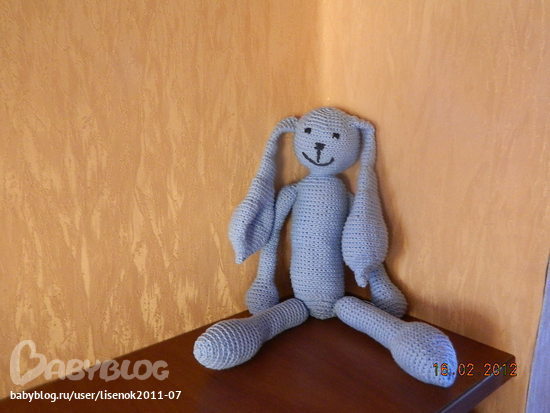 Подглядела у девушки Марии (не понимаю, как вставить ее аву..., извините) и просто влюбилась в этого милого зайчика! Но так как сама себе дала зарок заниматься развивающей игрушкой, то в уши вложила пуговки, в голову - полиэтилен, в тело - гремящее киндер-яйцо))))) Получилось как бы и развивающя игрушка, но вязалась, честно говоря, для себя.... И имя появилось само собой...