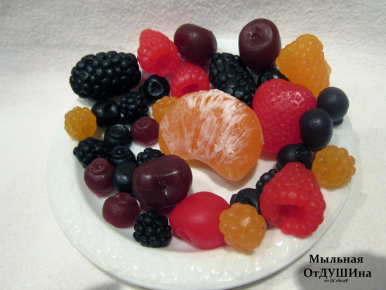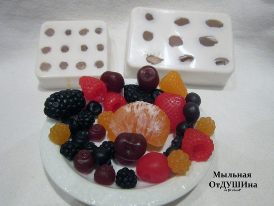 Благодаря нескольким девушкам, Леночке, Гале, Кате(из Брянска), у меня обновился ассортимент ягод)) Теперь, чтобы сделать пирожное "Лесные ягоды", не нужно целый день по штучке отливать маленькие ягодки, теперь у меня есть малинка, как настоящая, вишенки, и все это в великолепном мягком и не вонючем силиконе Молд Макс 10! Не надо ломать пальцы, рвать формы, чтобы достать ягодки. Мандариновую дольку слепила сама, вроде похожа))))
