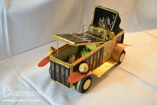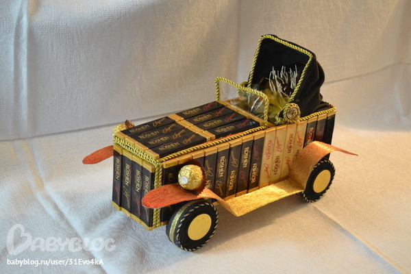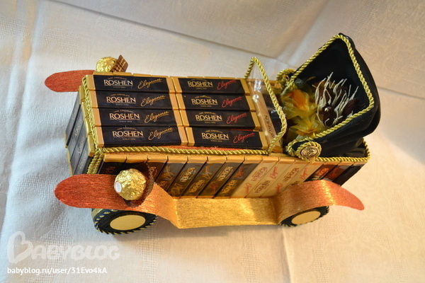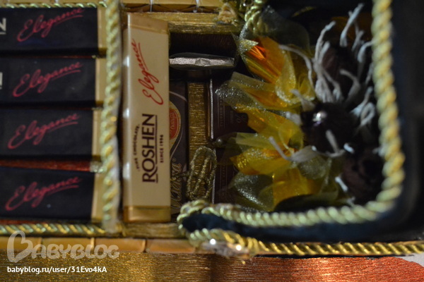 ну да ))))))) просто там надо сперва все выщитывать и подгонять по размеру из рассчета на шоколадки, учитывая погрешность, т.е каркас вырезать меньше на 3-4мм т.к при обклеивании гофрой эти мм вернуться.Да и вообще кажется что тут сложного, ведь цветов нет, а только клей да клей.А на самом-то деле до фига всего!!!! Но как говорится глаза боятся, руки делают.)))))) чуть клеевой пистолет не спалила )))))))))))))) и клея много ушло, это при том что при обтягивании каркаса гофрой я пользовалась двухсторонним скотчем