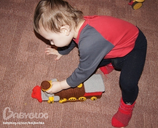 Макс мне еле дал собрать игрушку,как только я ему сказала,что это паровоз,то всё,он вокруг меня круги нарезал и стоило мне положить его на стол,чтоб поменять нитку,например,как он утаскивал его на пол и играл))) как появились колёса,так вообще,паровоз было не сыскать,Макс гонял по комнатам и с ним и на нём.Это первая игрушка,которую я отдала ему на растерзание.