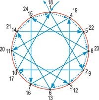 Заполнение окружности. Начертите циркулем окружность, поделите ее на 12 равных частей, сделайте проколы булавкой в точках деления. Вденьте нитку в иголку и заполните окружность по схеме.