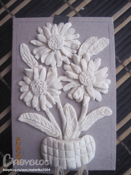 Солёное тесто (ТОЛЬКО ГОТОВЫЕ РАБОТЫ)Девочки расскажите , пожалуйста, как вы делаете картины: сразу на основу,на которой она останется или после сушки, покраски переносите и подбираете рамочку? Решила сделать на 8 марта. Я взялаобычную фоторамку, стекло выкинула, а картинку делала на кртонке.Покажу первые работы- вотя их покрашу, покрою лаком и вставлю обратно в рамочку, там еще будут отдельно божьи коровки , а задняя часть останется не покрытая лаком. Как вы думаете при повышенной влажности, картина будет впитывать влагу . А как делаете вы,