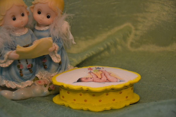 И нейтральная, желтенькая: шкатулка МДФ, рисовая карта, акриловые краски, контур, стекловидный лак.