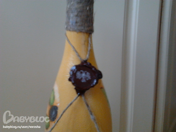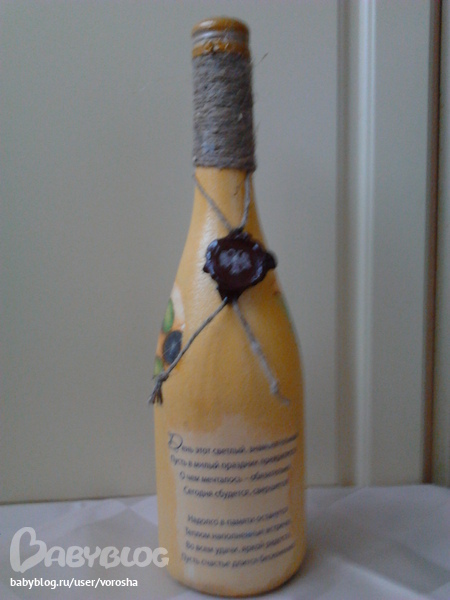 Бутылку делалана д.р. для лучшей подрги, вот уже писала о ней http://www.babyblog.ru/community/post/rukodelie/1732749 , а вот что получилось в итоге, печать имитация сургуча
