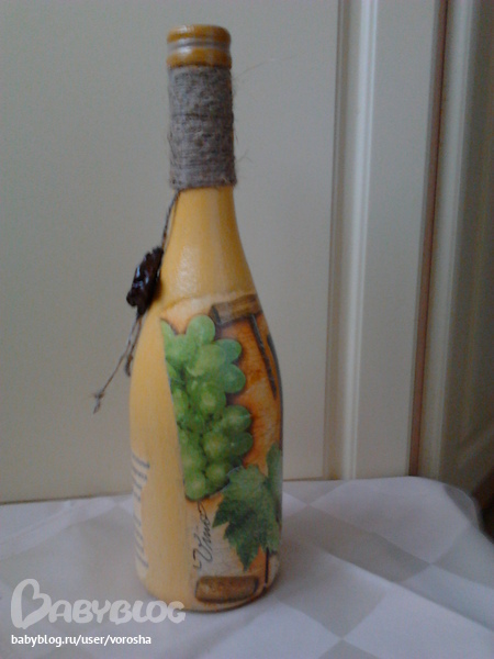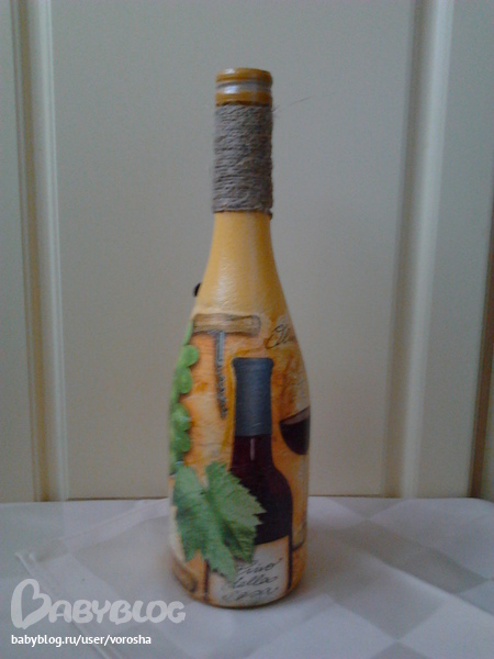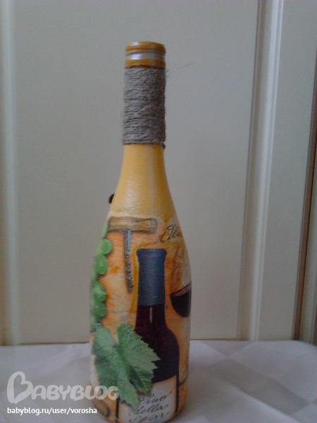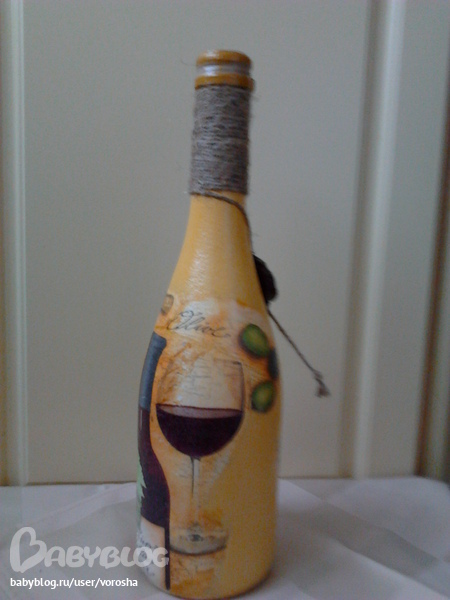 Да, основной мотив это салфетка, текст открытка, изначально не сделала перехода по цветам, а как сейчас исправлять ума не приложу. К тому же эта такая проблемная бутылка была, что когда что-то начало получаться, я просто боялась что-то менять