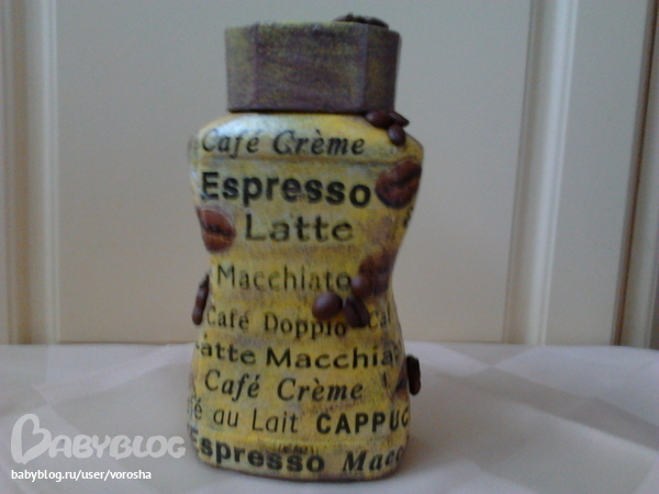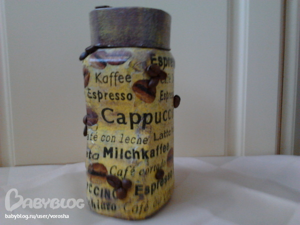 Баночка для кофе, обычная банка от кофе, отмыла обезжирила, наклеила мотивы (кое-где пришлось по буквам наклеивать