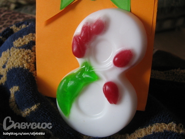 Мыло и косметика своими рукамиФух-ты. ну хоть что-то получилось! Ляпов куча, стебель не до конца залит, т.к. основа остывала настолько быстро, что я основу в стебель уже не выливала, а выкладывала ложкой и утрамбовывала. К сожалению не было зеленого пигмента, так что пришлось использовать зеленый водный краситель, но это мылко пробное для себя. Спасибо огромное за советы и поддержку Женечке и Катюшке ))) не знаю как на них ссылку вставить, но я думаю. что их все знают )))) теперь я по настоящему оценила их героизм)))))) Воть мой кошмарик......