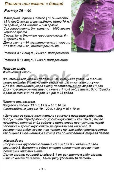 короче просто тупо вяжется прямым полотном с узором, и убавления для горловины, потом все закрывается по прямой, пото спина просто лицевыми вот и весь жакет, еслибез юбки, рукава естесно поняно как вязать тупо с прибавлениями т.к. проймы нет